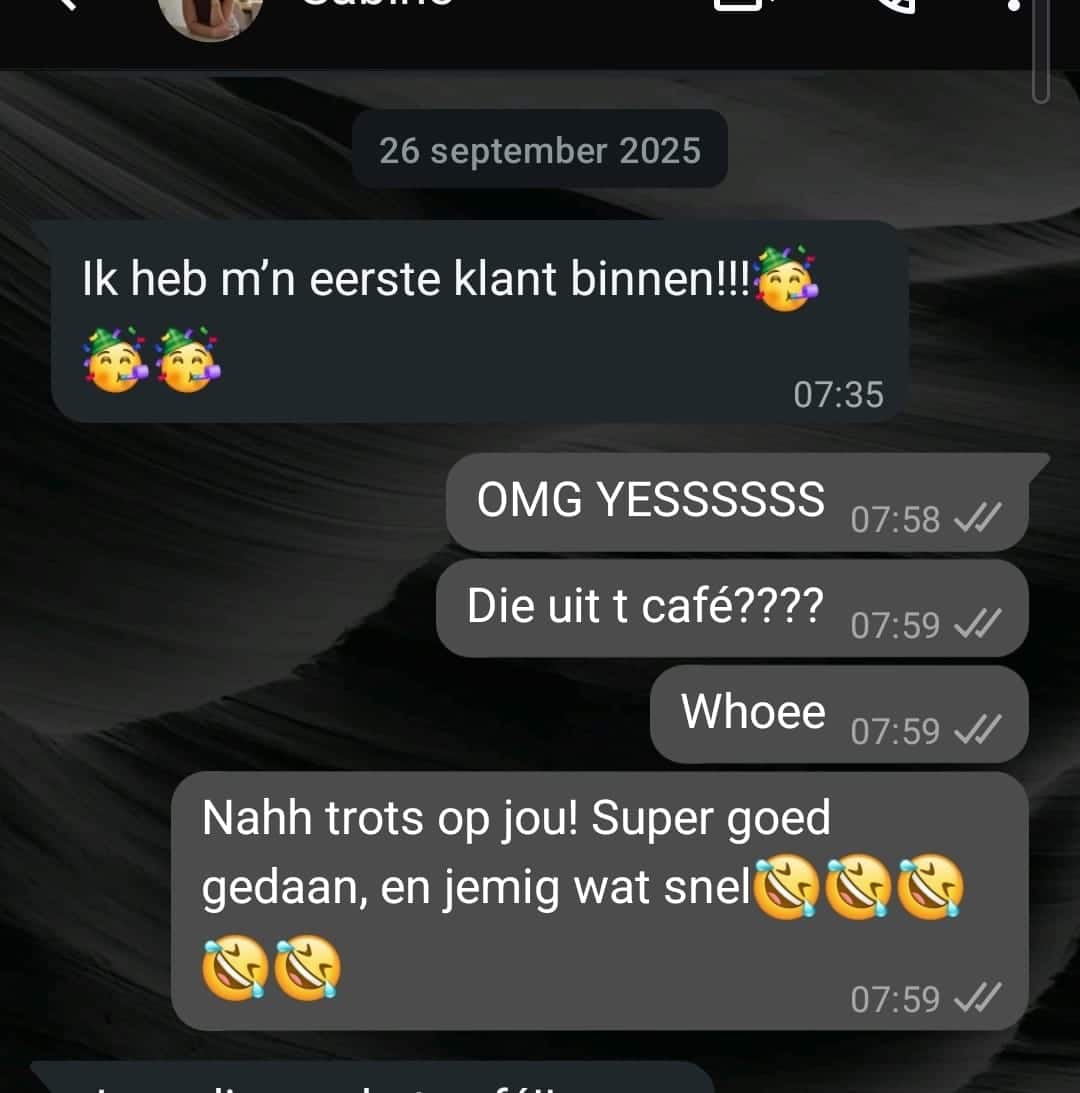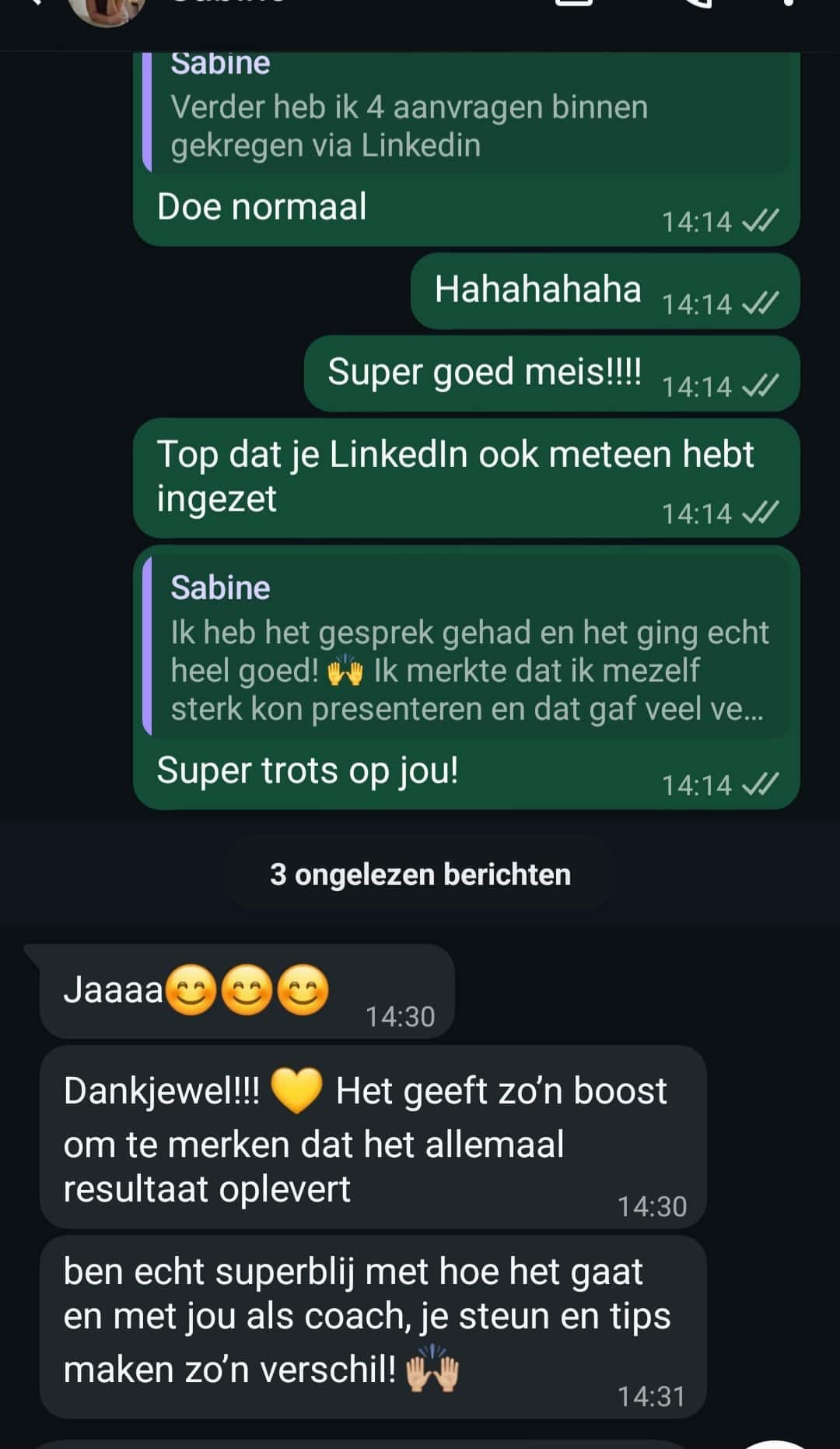Het hele traject ben ik er voor je. Dat betekent dat je naast de coachcalls ook WhatsAppsupport krijgt. Dagelijks kun je bij me terecht voor feedback, inspiratie of een liefdevolle schop onder je kont. 😉