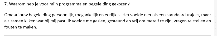 De samenwerking voelde intensief en persoonlijk. Ik kon met alle vragen terecht en voelde me echt gezien en gesteund. Dat gaf me het vertrouwen om stappen te zetten, keuzes te maken en mijn eigen weg te vinden als ondernemer. Het traject heeft mij rust, richting, zelfvertrouwen én klanten gegeven.