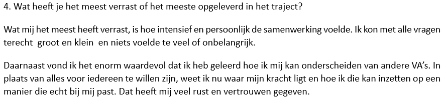 Wat ik heel waardevol vind, is dat ik heb geleerd hoe ik mij kan onderscheiden van andere VA’s. Ik weet nu waar mijn kracht ligt en hoe ik die kan inzetten, zonder mezelf te vergelijken of aan te passen.